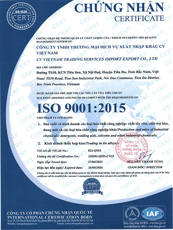 Đầu tiên CV VIỆT NAM xin gửi lời chào, kính chúc sức khỏe, thành công và lời cảm ơn đến Quý khách hàng đã ủng hộ những sản phẩm của chúng tôi. Với hơn 10 năm kinh nghiệm trong lĩnh vực hóa chất, dung môi,... Chúng tôi thấu hiểu được nhu cầu và thị hiếu của người tiêu dùng. Từ đó luôn nâng cao chất lượng phục vụ cho người sử dụng.